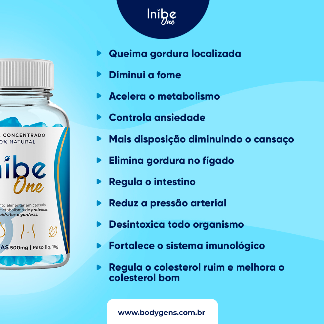 INIBE ONE Diminui o apetite. Os ativos presentes em seus compostos diminuem o apetite e reduzem a absorção de açúcares e gorduras no organismo. Regula.