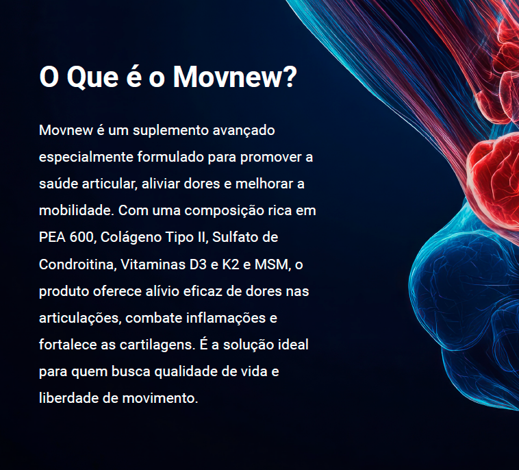 O Movnew é um suplemento de última geração focado na regeneração e proteção das cartilagens e tecidos conjuntivos. Diferente de soluções paliativas, ele atua na causa do desconforto, fornecendo os blocos de construção necessários para manter as juntas lubrificadas e resilientes.